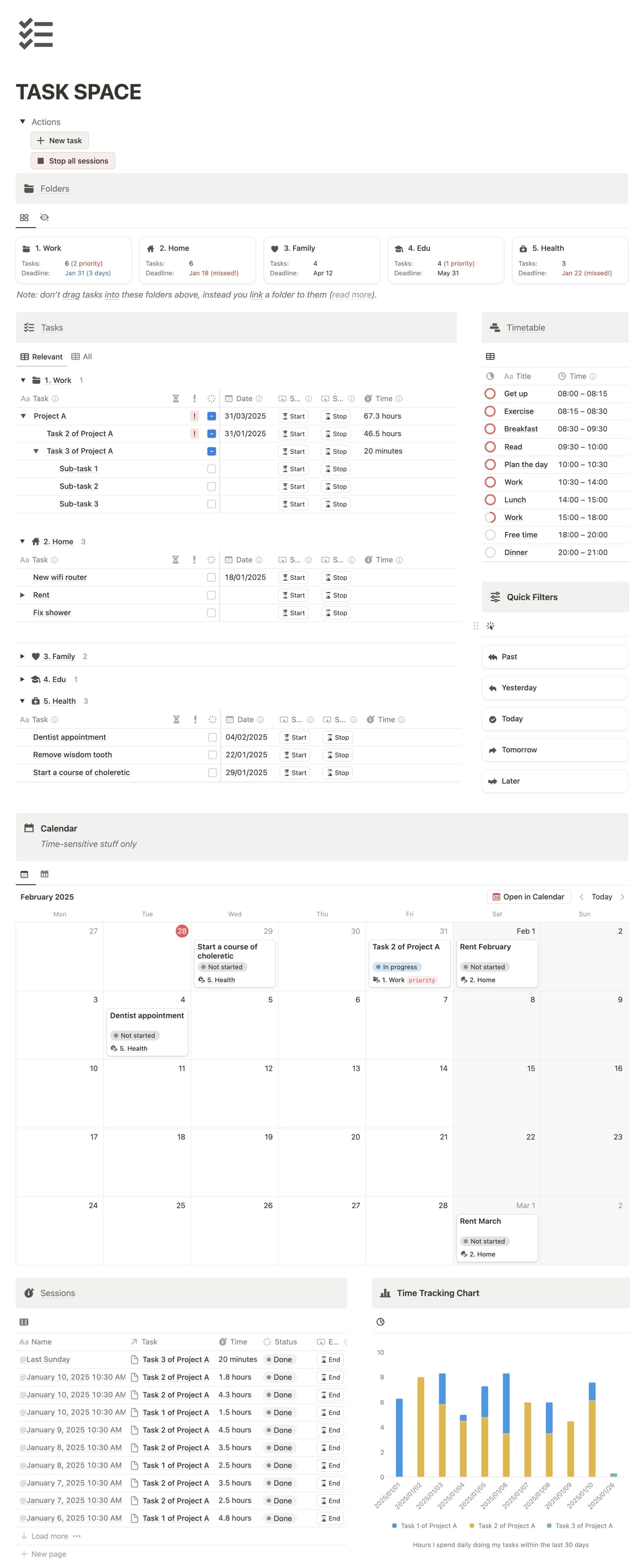 Imagine having simple checklists for daily to-dos, a calendar to track deadlines, a Kanban board for managing projects, and folders to keep tasks neatly organized by different areas of your life — all in one workspace.